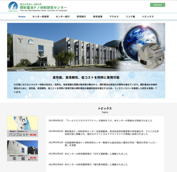 山梨大学 燃料電池ナノ材料研究センター様のウェブサイトをリニューアルさせていただきました。 CO2フリーの実現に向けて躍進するグリーンテクノロジーを担う研究センターです。
